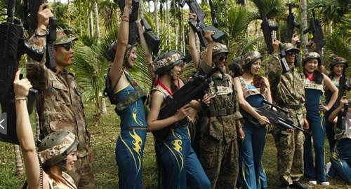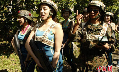 正在海南三亞參加美麗之冠2014世界休閑小姐大賽中國年度總決賽的佳麗,身穿迷彩手持激光槍體驗真人CS訓(xùn)練。